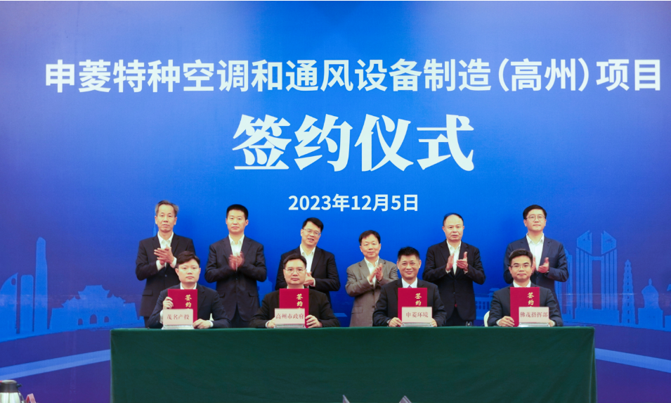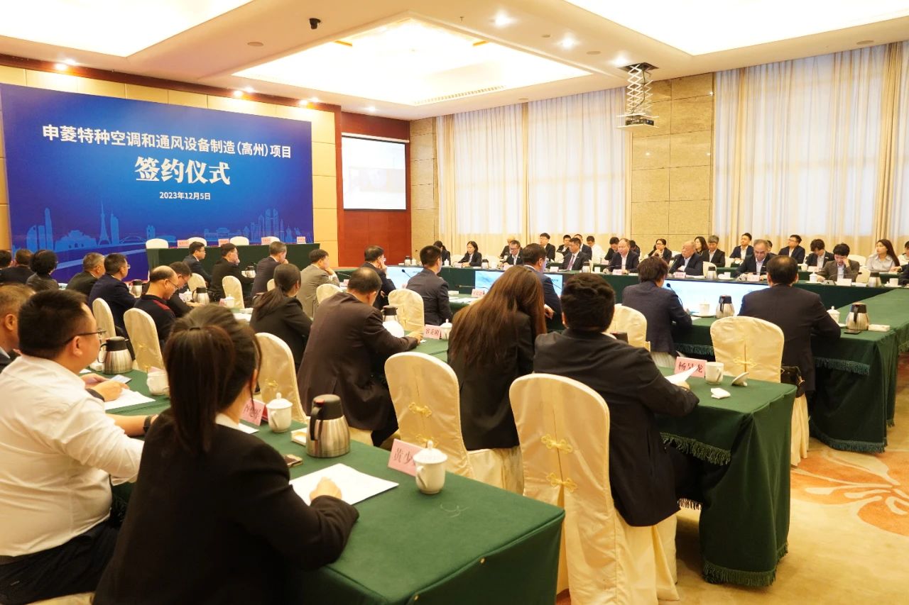 2023年12月5日,“申菱特种空调和通风设备制造(高州)项目”签约仪式在茂名高州隆重举行。茂名市委副书记罗晃浩,茂名市委常委、常务副市长王长青,茂名市委常委、高州市委书记王土瑞,佛山市人大副主任、市总工会主席徐东涛等政府班子领导成员出席了活动,广东申菱环境系统股份有限公司董事长崔颖琦、总裁潘展华等董监高一行参与签约仪式。