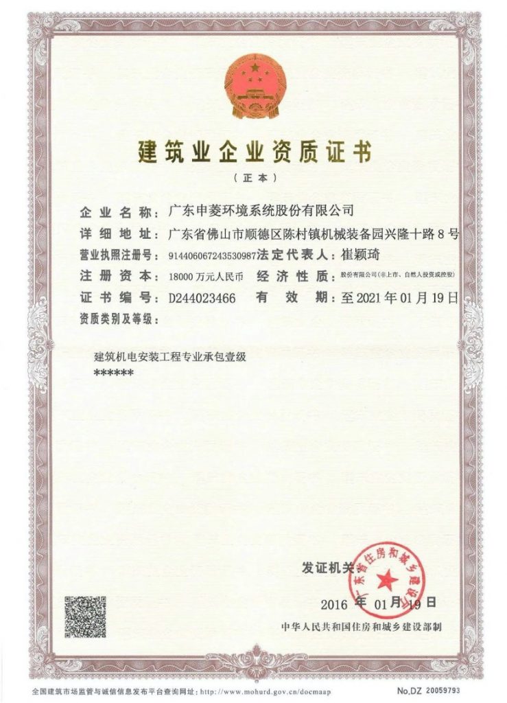 申菱环境有10余年空调工程设计、施工经验,并已具有“机电设备安装工程专业承包一级资质”,是华南地区专业提供空调系统工程整体解决方案的大型承建商之一。目前已承接多个国内外电网工程、医疗净化工程、机场轨道交通工程、数据中心机房工程、大型市政建筑工程的工程项目施工。2007年承建的“中山市文化艺术中心”荣获中国建筑工程最高奖项“鲁班奖”。