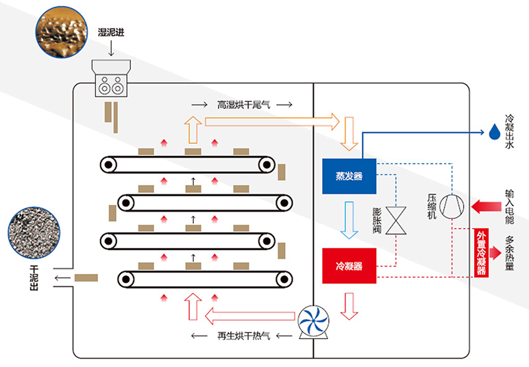 湿污泥从顶部切条机入料,逐层均匀分布于缓慢移动的烘干网带面上,干泥从底部出料口出料。设备能连续将脱水后的湿污泥最低干化至10%的含水率,并排出冷凝水回流至污水池。